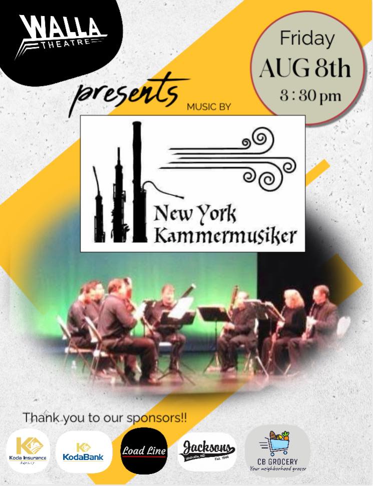 Walla Theatre 909 Central Ave, Walhalla, NDThe New York KAMMERMUSIKER looks forward to our performance in one of ND oldest settlements (est,1845). Walhalla, North Dakota is noted for fur trading and the Métis Culture (a mixture of European and Indigenous descent). NYK will include Icelandic and Irish folk songs, as well as a Métis jig on our Classical program.