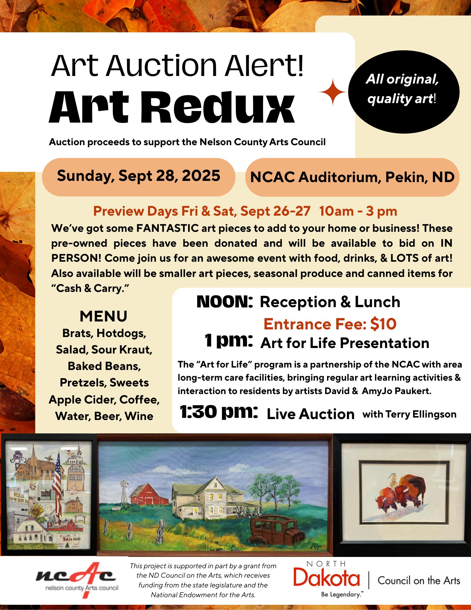 Nelson County Arts Council Auditorium 121 Main St, Pekin, ND, United StatesCome to Pekin on Sunday, September 28th, for an awesome afternoon! Be there at NOON for a delicious lunch of brats, salad, sour kraut, baked beans, homemade pretzels, and bars, along with apple cider, coffee, beer, and wine.If you wish to preview the art, the auditorium will be open from 10 am to 3 pm […]