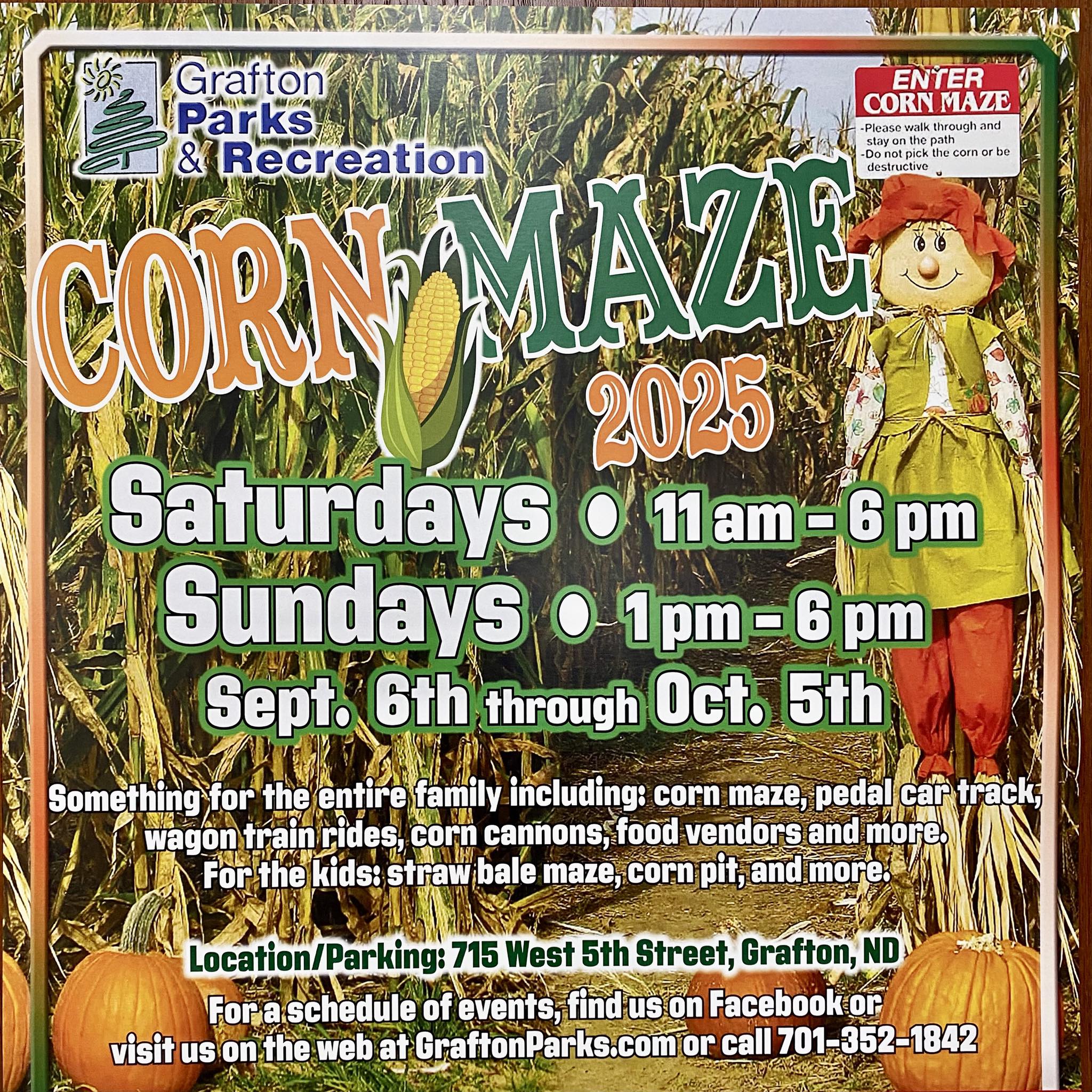 Something for the entire family: Corn maze Corn Pit Wagon Train Rides Corn Cannons Sports Zone Pedal Cars Playset Obstacle Course Food Vendors Saturdays 11 AM to 6 PM Sundays 1-6 PM |