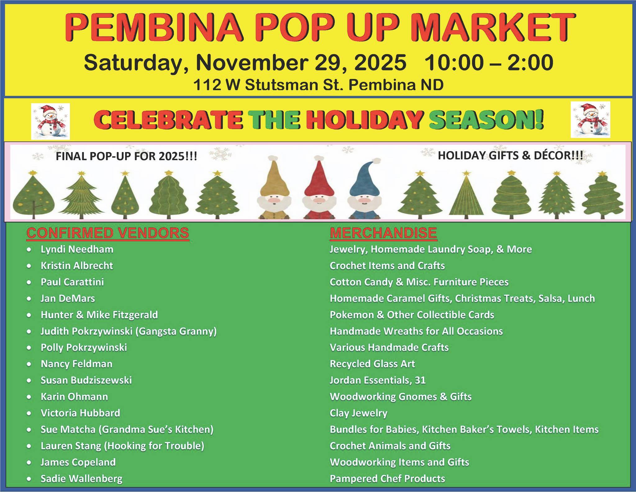 Grab & Go-bble: Everything but the Bird Hosting Thanksgiving just got a whole lot easier! This special pop-up event brings together local bakers, makers, and growers so you can stock up on everything you need for your holiday hosting— without the stress. What you’ll find: Fresh baked rolls, cookies, and artisan breads. Homemade jellies, salsa […] |