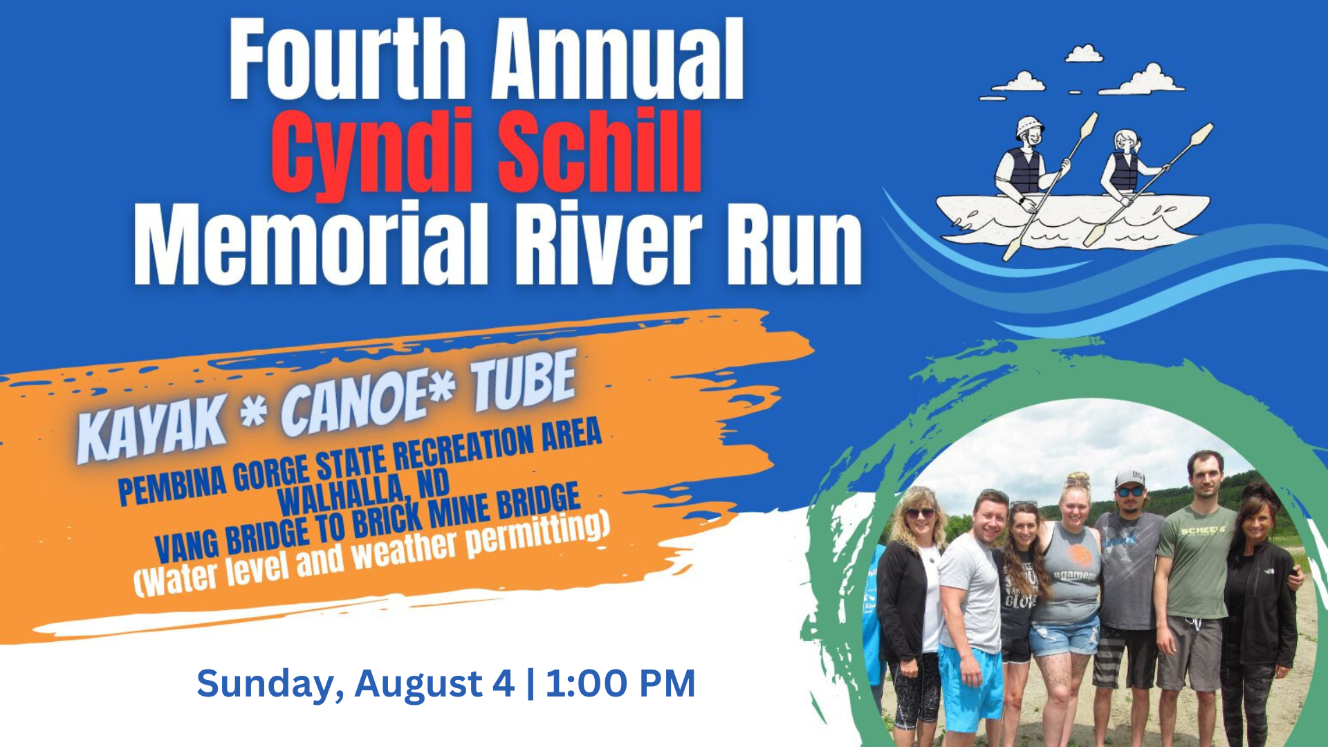 Pembina Gorge State Recreation Area Walhalla, ND, United StatesRide the Pembina River on kayak, canoe, or tube in memory of Cyndi Schill. Proceeds support scholarships to the R-COOL Scrubs Academy at UND Center for Rural Health.