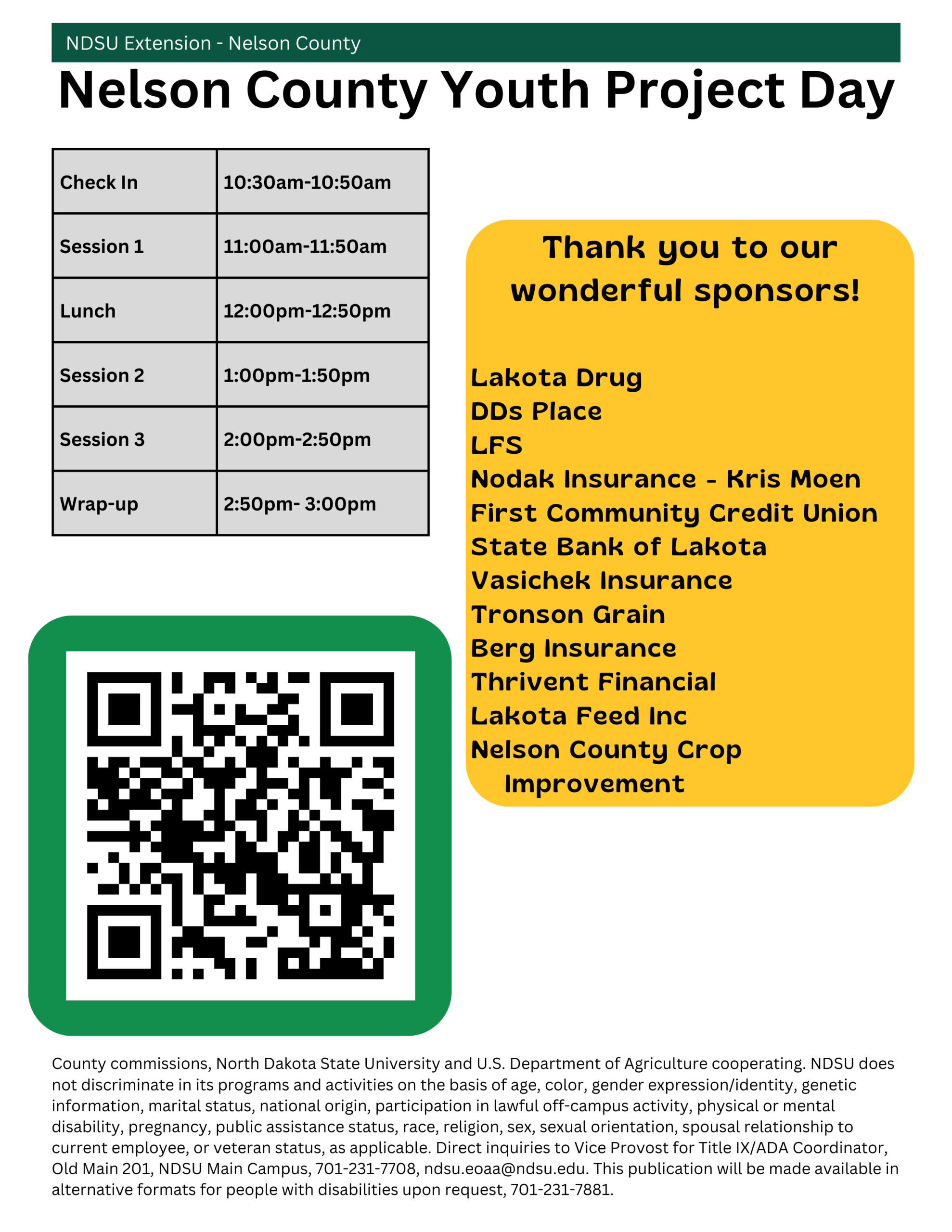 Nelson County is excited to host our 2025 Youth Project Day on Tuesday, December 31st at Dakota Prairie High School! This hands-on event is open to ALL youth ages 5–18 […] |
